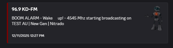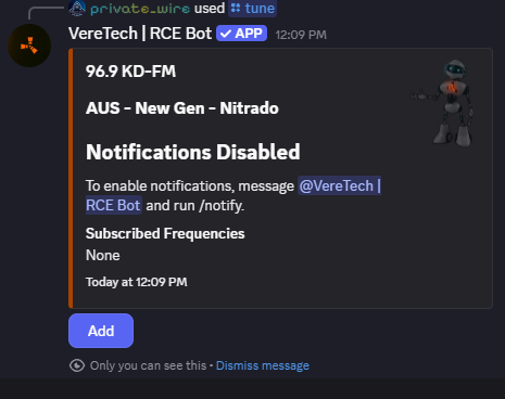 Once your frequency is triggered, you will receive a message from the VereTech RCE Bot with the Name, frequency and Gameserver name where the broadcast is occuring.